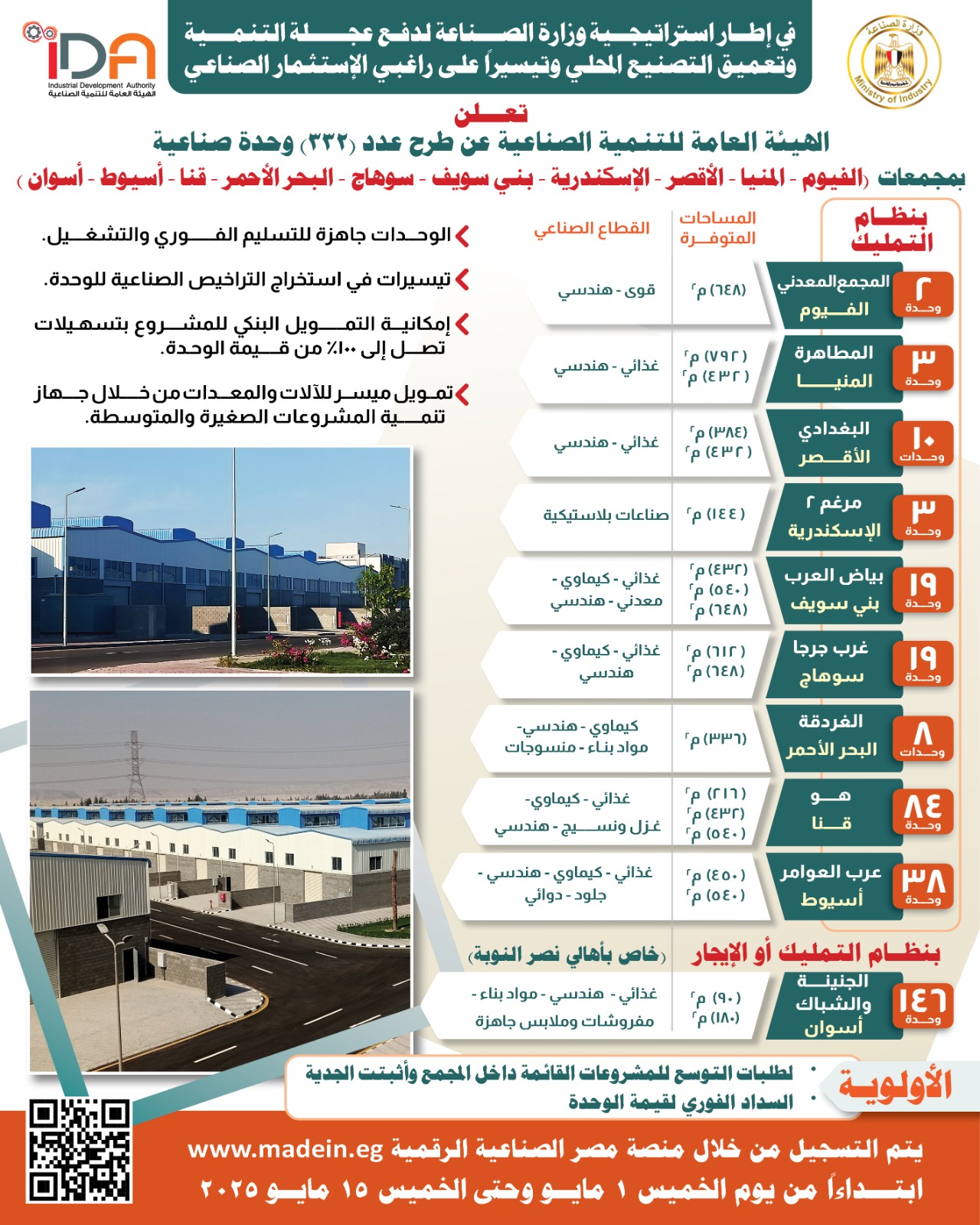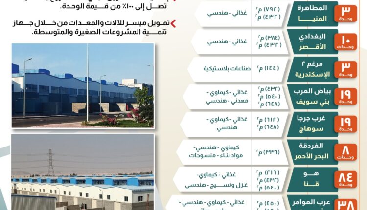 صرح الوزير أن الوحدات سيتم طرحها في ١٠ مجمعات صناعية بكل من مجمع بياض العرب ببني سويف (١٩ وحدة ) ومجمع عرب العوامر باسيوط (٣٨ وحدة) ومجمع هو بقنا (٨٤ وحدة) و غرب جرجا بسوهاج (١٩ وحدة) ومجمع المطاهرة بالمنيا (٣ وحدات ) والبغدادى بالاقصر (١٠ وحدات ) ومجمع الجنينة والشباك باسوان (١٤٦ وحدة ) والمجمع المعدنى بالفيوم (وحدتين) فضلا عن مجمع الغردقة بالبحر الاحمر (٨ وحدات ) ، ومجمع مرغم ٢ بالاسكندرية (٣ وحدات)