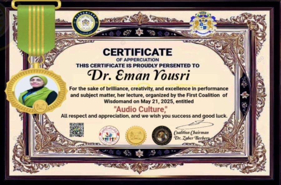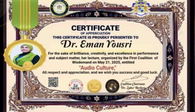 وقامت أرض الحكمة برئاسة دكتور زبير بتكريم إيمان يسري على مجهوداتها المبذولة في إثراء الثقافة العامة، للارتقاء بمستوى الفرد والمجتمع.