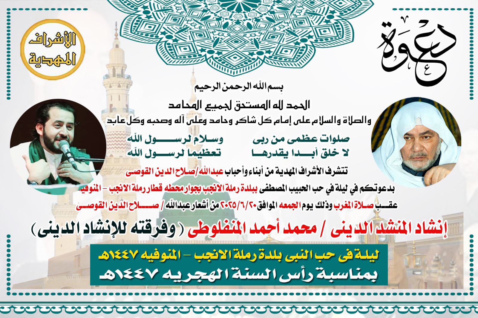 اولا:احتفال ببلدة رملة الانجب المنوفيه يوم الجمعة الموافق 20 يونيو بعد صلاة المغرب ويحى الحفل فرقة ابن سيدنا و مولانا الشيخ صلاح الدين القوصي السيد محمد أحمد المنفلوطى وفرقته للانشاد الدينى.