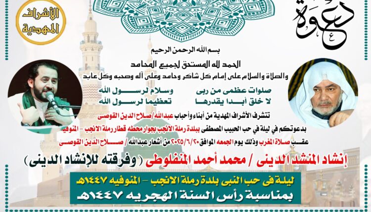 اولا:احتفال ببلدة رملة الانجب المنوفيه يوم الجمعة الموافق 20 يونيو بعد صلاة المغرب ويحى الحفل فرقة ابن سيدنا و مولانا الشيخ صلاح الدين القوصي السيد محمد أحمد المنفلوطى وفرقته للانشاد الدينى.