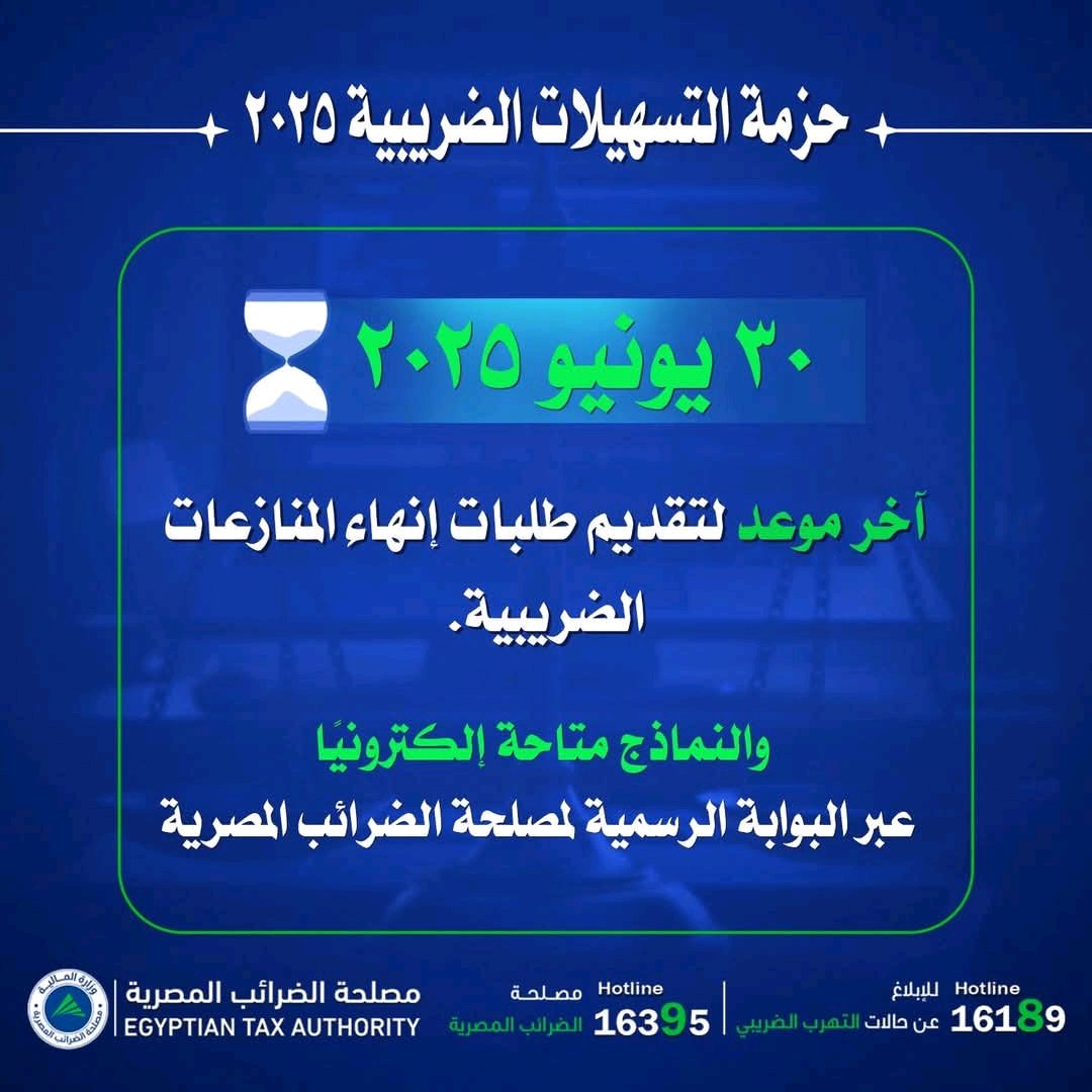 رئيس مصلحة الضرائب المصرية: – ٣٠ يونيو آخر موعد لتقديم طلبات إنهاء المنازعات الضريبية.. والنماذج متاحة إلكترونيًا عبر البوابة الرسمية