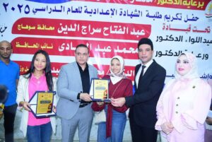 و تم خلال الاحتفالية التي شارك فيها الدكتور محمد عبد الهادي نائب محافظ سوهاج والدكتور محمد السيد وكيل وزارة التربية والتعليم والدكتور أحمد حمادى وكيل وزارة الازهر الأسبق ورئيس المنظمة العالمية لخريجي الأزهر الشريف والدكتورة سامية الشريف مدير عام التعليم الاعدادى المركزى بالمديرية تكريم ٤٠٠ طالب من ابناء سوهاج المتفوقين في الشهادة الإعدادية .