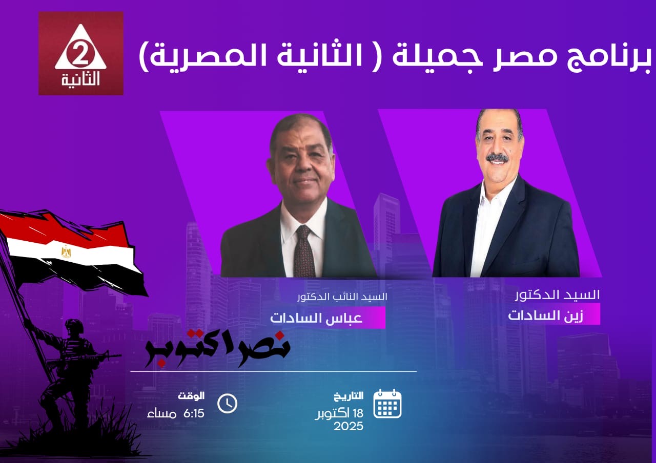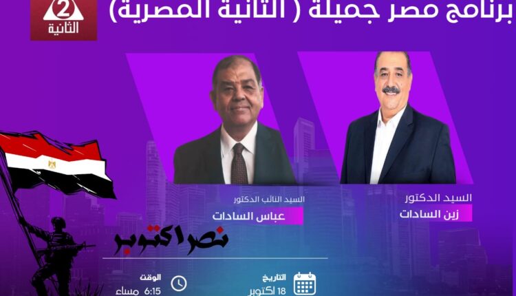 يحل مساء اليوم السبت ١٨ اكتوبر الدكتور زين السادات المدير لتنفيذي لمركز شاف لتحليل الازمات والدراسات المستقبلية و النائب عباس السادات عضو مجلس النواب في لقاء مميز على القناة الثانية المصرية ببرنامج “مصر جميلة” في تمام السادسة والربع مساءً، حيث يحل كلٌ من: