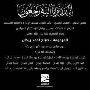 يتقدم رجل الأعمال المصري إيهاب الجندي نائب رئيس مجلس الإدارة و العضو المنتدب لمجموعة شركات مرسيليا بيتش للاستثمار السياحي بواجب العزاء في وفاة المغفور لها بإذن الله تعالي المرحومة صباح أحمد زيدان حرم عباس بن محمود أكبر على رضا .